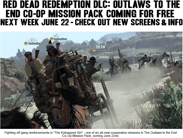 The free-to-download Outlaws To The End Co-Op Mission Pack for Red Dead Redemption will be available next week, Tuesday June 22nd for both Xbox LIVE® (requires Xbox LIVE Gold Membership for online play) and PlayStation®Network. The pack includes six all-new co-op multiplayer missions to play with 2-4 players.