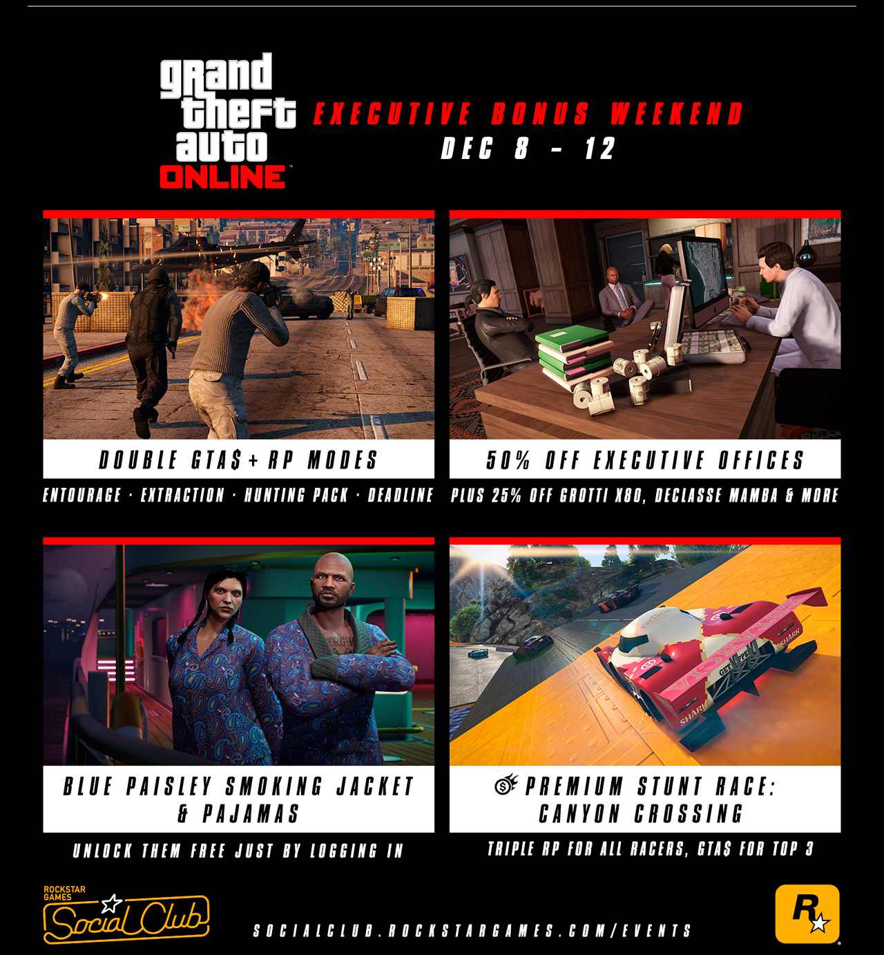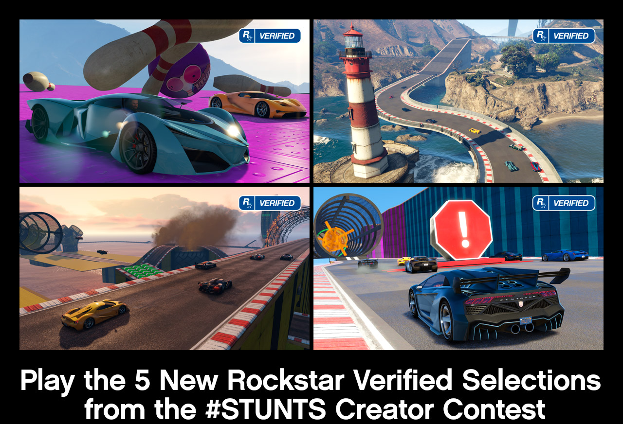 | | | | | | | | We are pleased to announce the winners of our Rockstar Verified Creator Stunt Races Contest – congrats to Slimjim171, eclaide38, neogry, Serg3n and shawface. Along with the bragging rights that come with being officially Rockstar Verified, these Creators will each be receiving a cool GTA$8,000,000. Be sure to check out these latest additions to the Rockstar Verified list and, for easy access, jump directly into our Rockstar Verified Playlist starting today and running through December 12th. For details and links to each new Verified Job, visit the Rockstar Newswire. | |